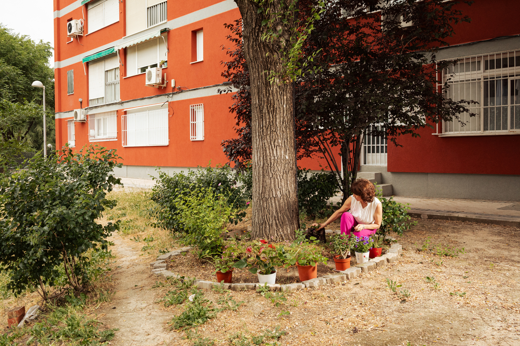 También tiene tiempo para otras intervenciones más locales de acupuntura urbana, como ajardinar el alcorque frente a su portal con flores y aromáticas.